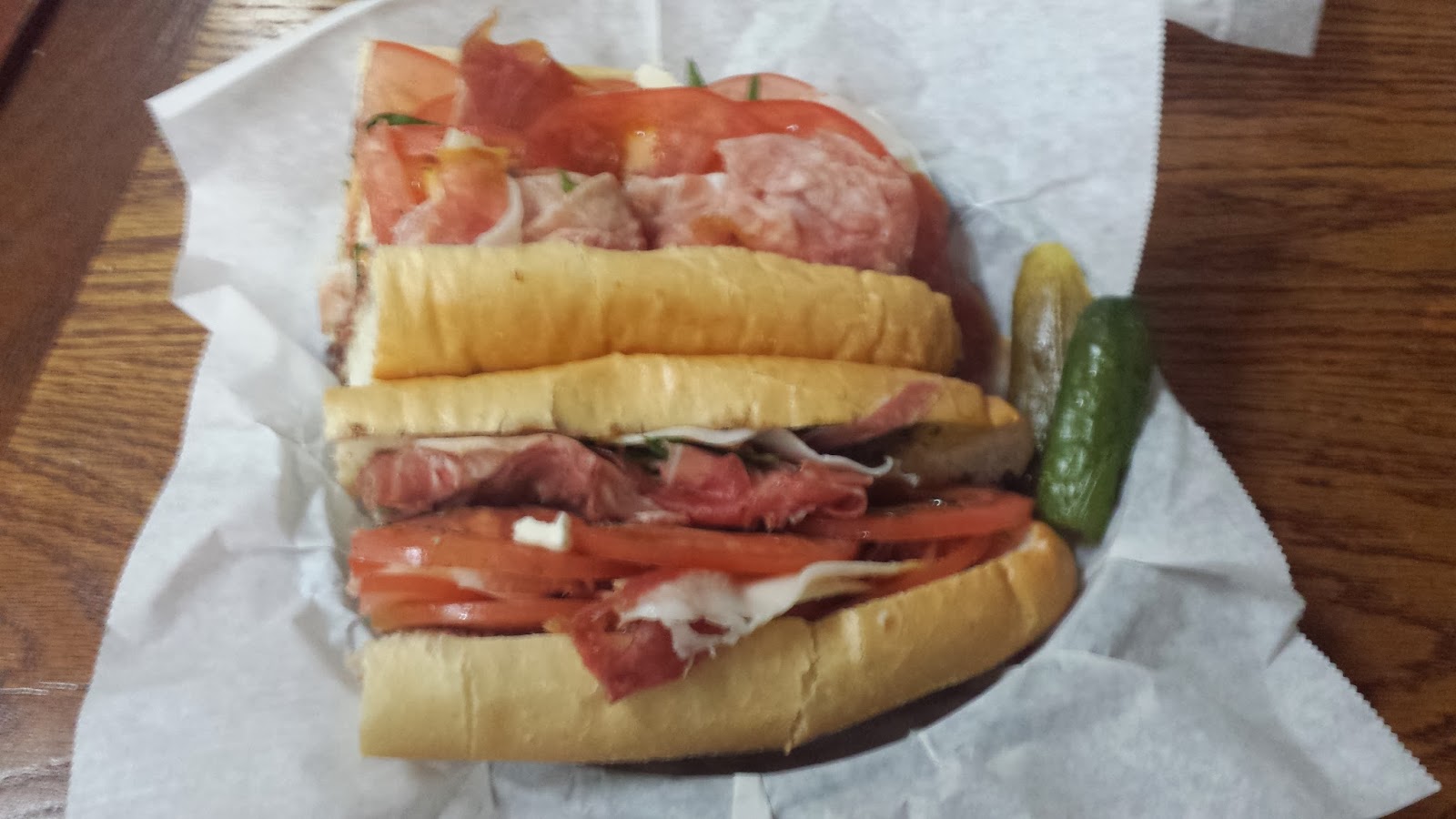 | This is an amazing sandwich called the Caprese. Freshly Sliced Tomatoes, Basil, House-made Mozzarella on a Fresh Hoagie Roll, then it's drizzled with Balsamic Vinegar and Basil Oil...WOW! Caryn loves it as is, but you do have the option to add fresh Prosciutto, which is what Matt gets and is pictured above. Notice the house made pickles that come with everything. |